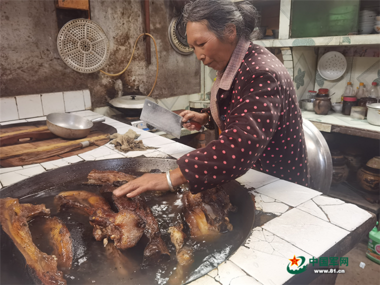 灶台上煮的,是当地群众各家各户自制的腊肉。听说要给来救灾的子弟兵和志愿者们做饭,不需要动员,乡亲们纷纷清点起家里的“存货”。有人背来十几条腊肉,有人送来几十斤大米,还有一筐筐茄子、豆角、萝卜……全村老少自发地聚在一起,为参加救援的应急抢险队伍和志愿者们做出一锅锅热乎乎的“百家饭”。