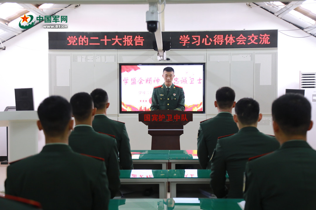 国宾护卫中队荣誉室内,政治指导员刘赫结合队史,与官兵交流学习党的二十大报告体会。“新时代党和国家取得的伟大成就,在于有以习近平同志为核心的党中央掌舵领航,在于有习近平新时代中国特色社会主义思想指引航向;国防和军队现代化建设取得的伟大成就,根本在于党旗光辉的永恒照耀、在于有习近平强军思想的科学指引。”