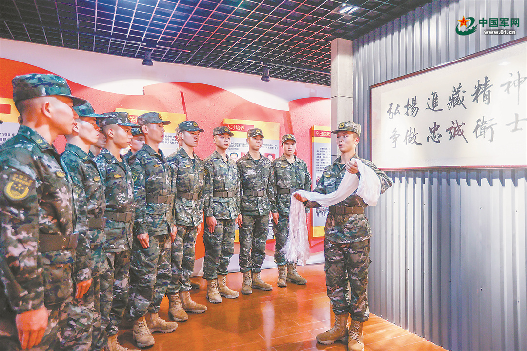 六中队队史讲解员蔡江龙(右一)为战友讲述进藏官兵的故事。盛相良摄