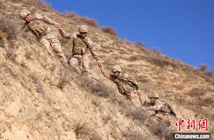 图为武警青海总队机动某支队武警官兵协作穿越复杂地形。罗元凯 摄