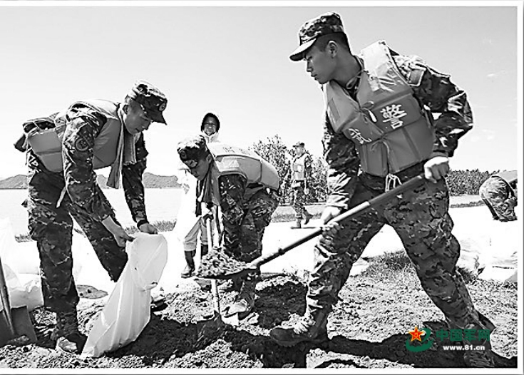 大家看在眼里,急在心里,一锹接着一锹地装填沙袋,不敢有半点懈怠。子堤构筑完成后,我和战友又来到陶善友家中,帮助老人将家具家电搬至二楼。回营前,老人紧紧握住我们的手,感激地说:“谢谢你们,当兵的真是好样的!”