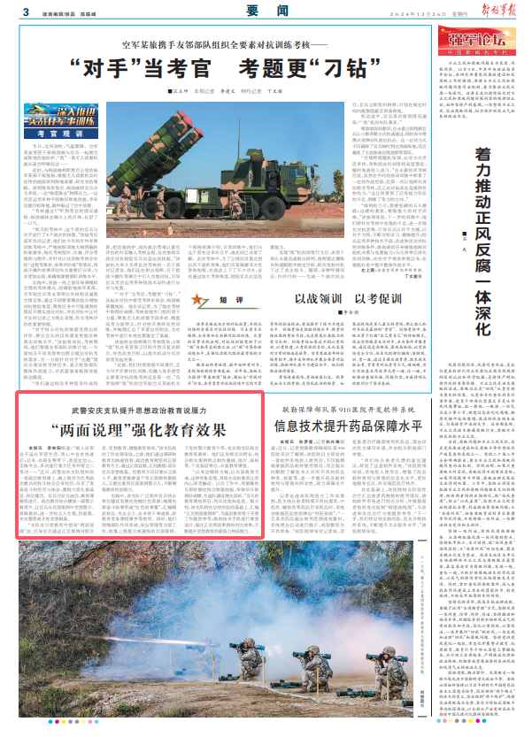 “支队在日常教育中倡导‘两面说理’法,引导官兵通过正反案例对照反思、受到教育,增强教育质效。”该支队政治工作处领导说,之前,他们通过调研和教育实践感悟到,政治教育要坚持正面教育为主,通过正面宣教、正向激励,筑牢官兵思想根基。但教育不仅仅要从正面入手,教育者既要善于用正面榜样激励人,又要注重用反面案例警示人,不断增强教育的说服力。