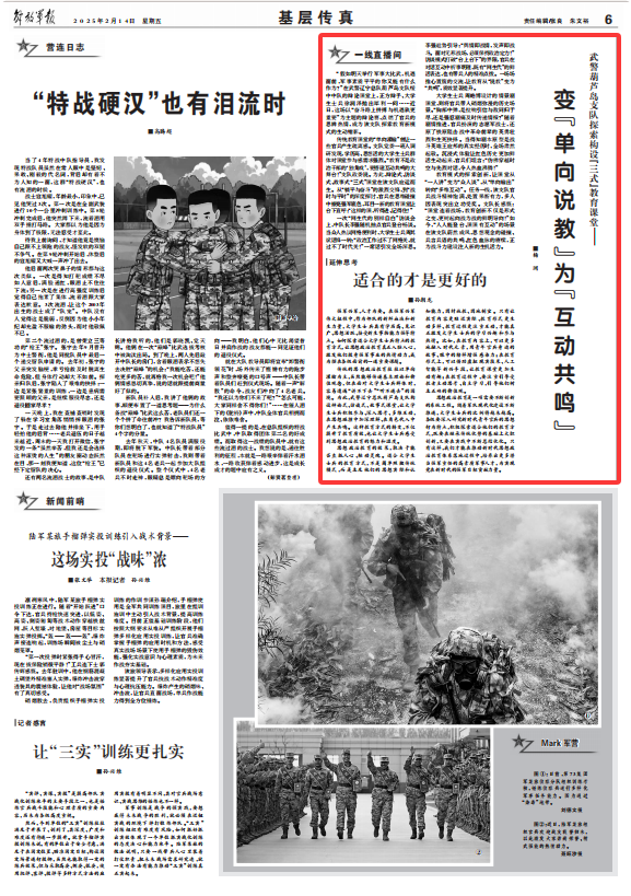 传统教育课堂的“单向灌输”曾让一些官兵产生疏离感。支队党委一班人调研发现,学历高、思想活的大学生士兵群体对课堂参与感需求强烈。“教育不是政治干部的‘独角戏’,要搭建互动共鸣的大舞台!”支队政委说。为此,辩论式、访谈式、故事式“三式”课堂在该支队应运而生。从“躺平与奋斗”的激烈交锋,到“战时与平时”的深度探讨,官兵在思维碰撞中擦亮强军底色,耳目一新的教育课堂让台下直呼:“这样的课,听得进、记得住!”