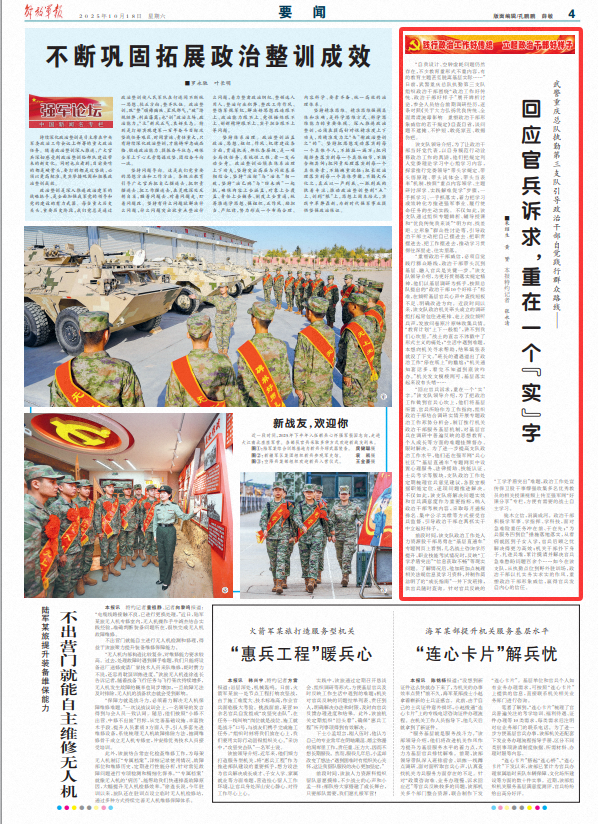 徙木立信,涓滴成河。政治干部积极学军事、学指挥、学科技,面对急难险重任务冲在前、干在先;“为兵服务四到位”措施落地落实,从看病就医到子女入学,官兵后顾之忧解决得更为高效;机关干部扑下身子、扎进兵堆,累计摸清并解决官兵急难愁盼问题百余个……如今在该支队,从执勤点位到野外驻训场,政治干部以扎实务实求实的作风,重塑政治干部形象威信,赢得官兵发自内心的信任。