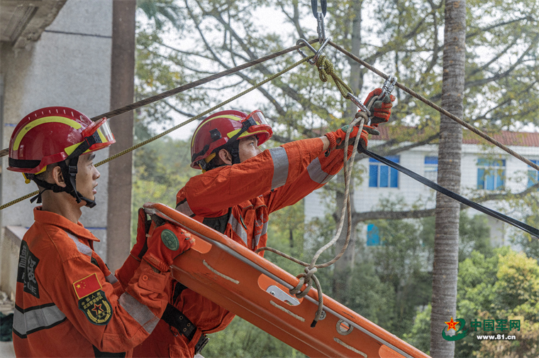 武警广西总队机动支队工兵分队官兵进行绳索救援。何家龙 摄