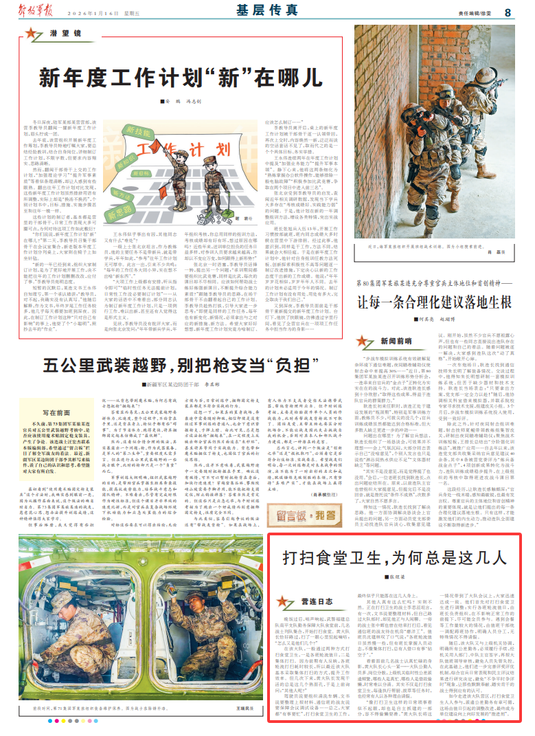 如今走进该大队营区,打扫食堂卫生人人参与,派遣公差勤务有章可循,这场由值日引起的调整改进,最终成为单位建设向上向好发展的“推进剂”。