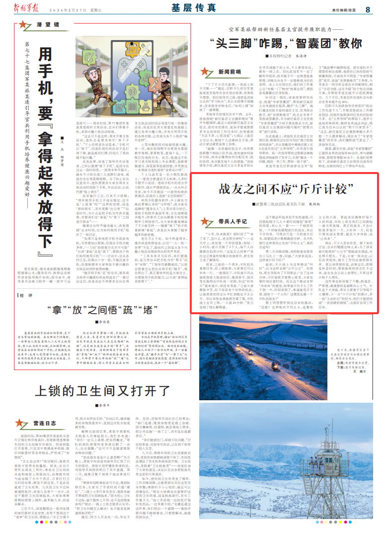 这件事也给我提了个醒:抓基层、严管理,最重要的是凝聚兵心士气。中队是个大家庭,带兵人要善于引导每个人懂得,少一点“斤斤计较”的算计,多一些“主动补位”的担当,我们才能团结成“一块坚硬的钢铁”,完成好各项工作任务。