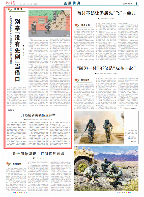 现在,我随身携带一个笔记本,专门用来记录那些没有先例但值得推动的事项。我想,只有探索创新的尝试越来越多,“没有先例”的困扰才会越来越少,才能推动部队建设在锐意进取中实现高质量发展。