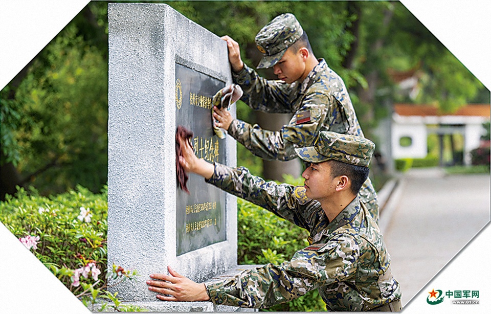 某部官兵在清明祭扫活动中擦拭烈士纪念碑。朱辉煌 摄