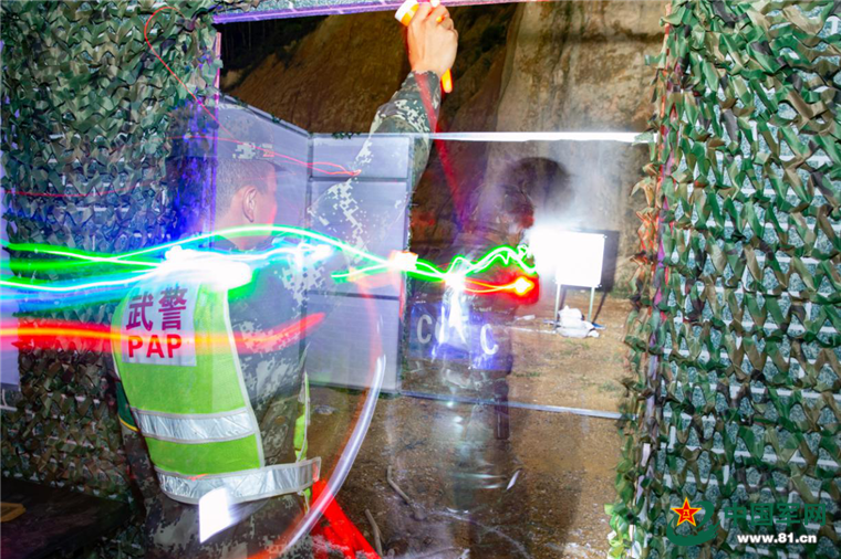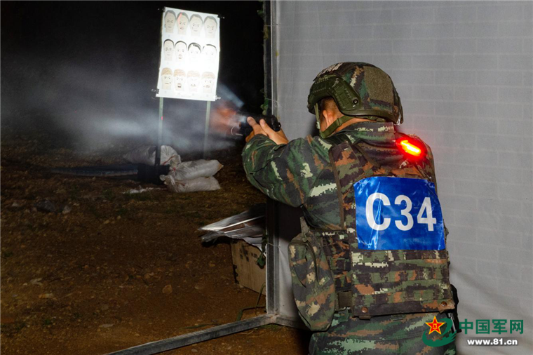 近日,武警部队“巅峰-2020•广西总队”特战侦察比武场上,夜间突入识别射击课目悄然展开。该课目要求参赛队员在规定的时间内随机抽选5个目标快速记忆,在指挥员下达口令后,10秒内迅速突入到房屋内,对目标实施射击。