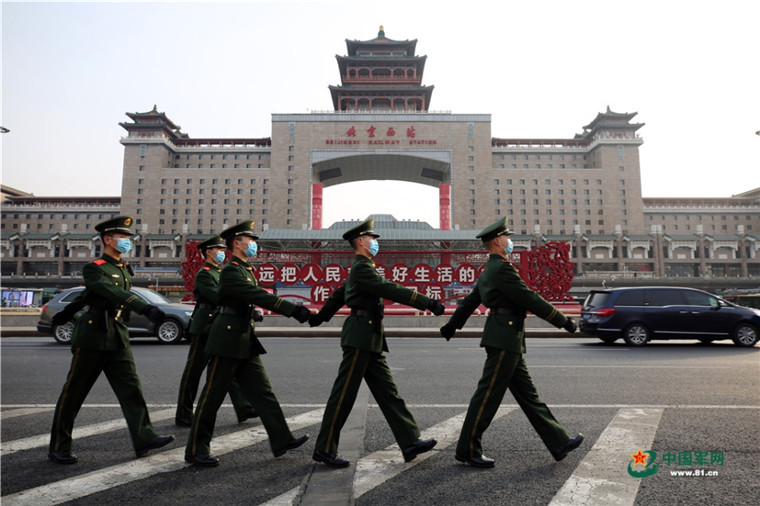 担负北京西站守卫任务的武警北京总队执勤第六支队官兵精神抖擞地走向战位,执勤巡逻于各重要区域,以实际行动守卫旅客平安出行。赵明 摄