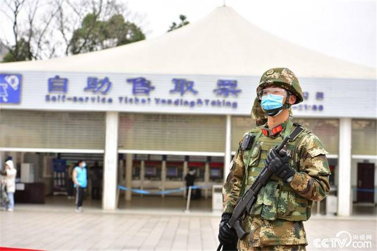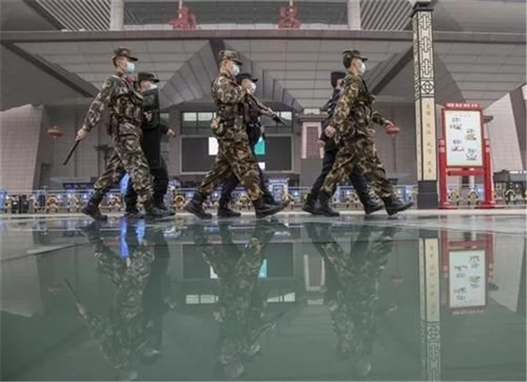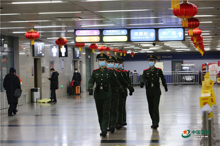 武汉市武昌火车站站前广场,武警官兵、特警联勤巡逻,秩序井然。