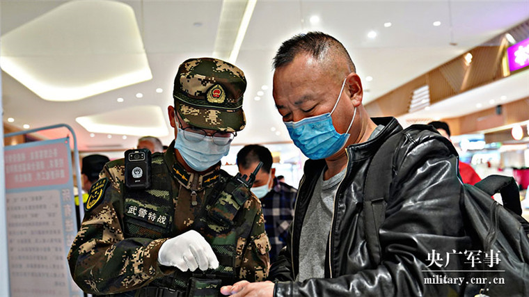 武警曲靖支队执勤官兵严格按照防疫要求戴口罩、护目镜。