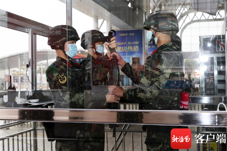 担负海口火车东站春运执勤任务的武警官兵在封闭式岗台进行哨位交接。