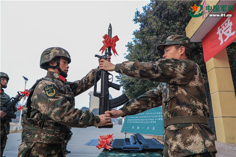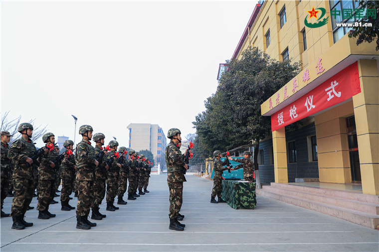随着一句句铿锵有力的答“到”声,一排排新战士从老战士手中接过神圣的钢枪,个个精神饱满,士气高昂。