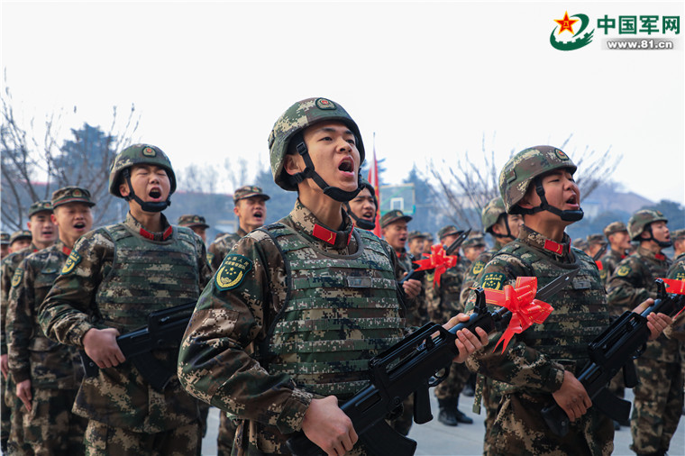 战士们齐唱中国人民解放军军歌。钱彦奇摄