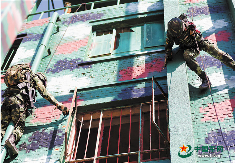 武警新疆总队某机动支队官兵开展楼房索降训练。王雅慧摄