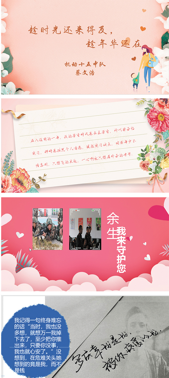 “现在,我是一名光荣的武警战士,我不会再让您受苦受累。以前,您总是为我担惊受怕,余生,请换我来守护您!”