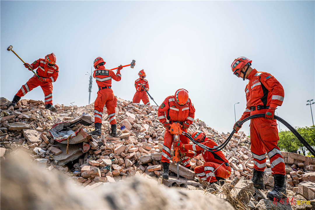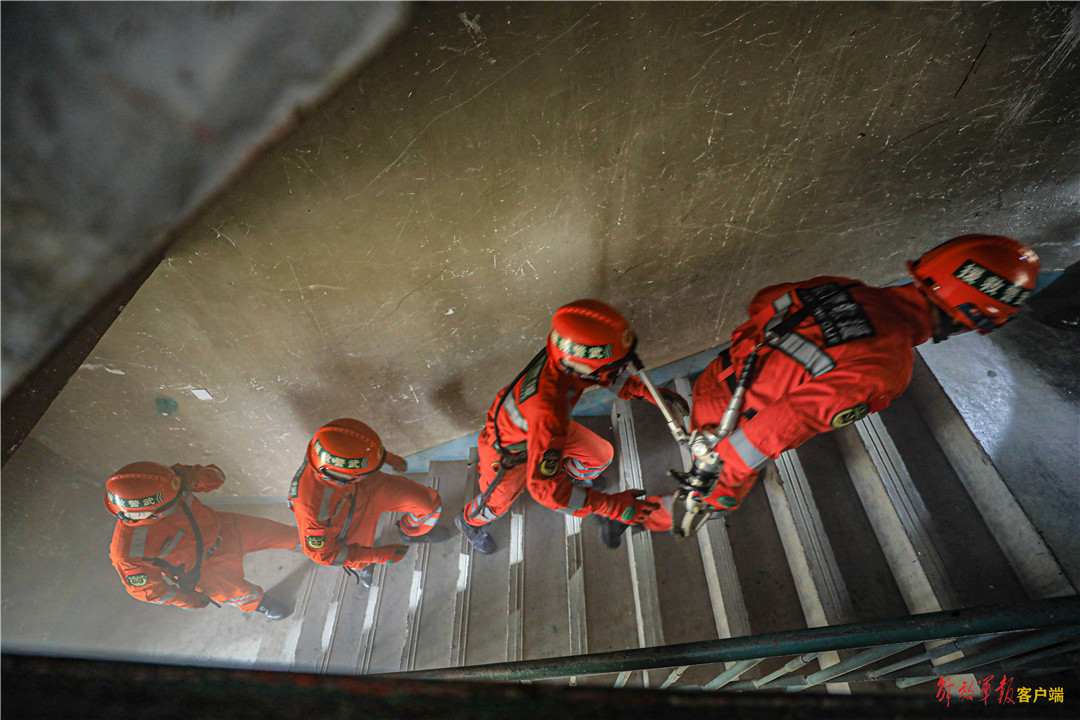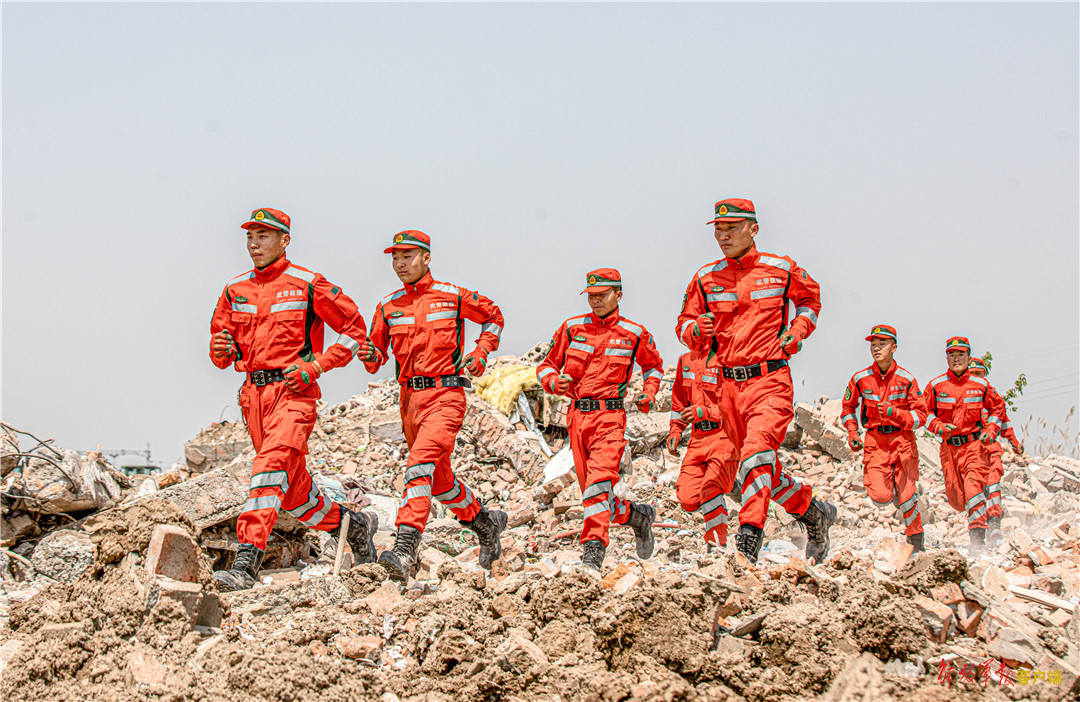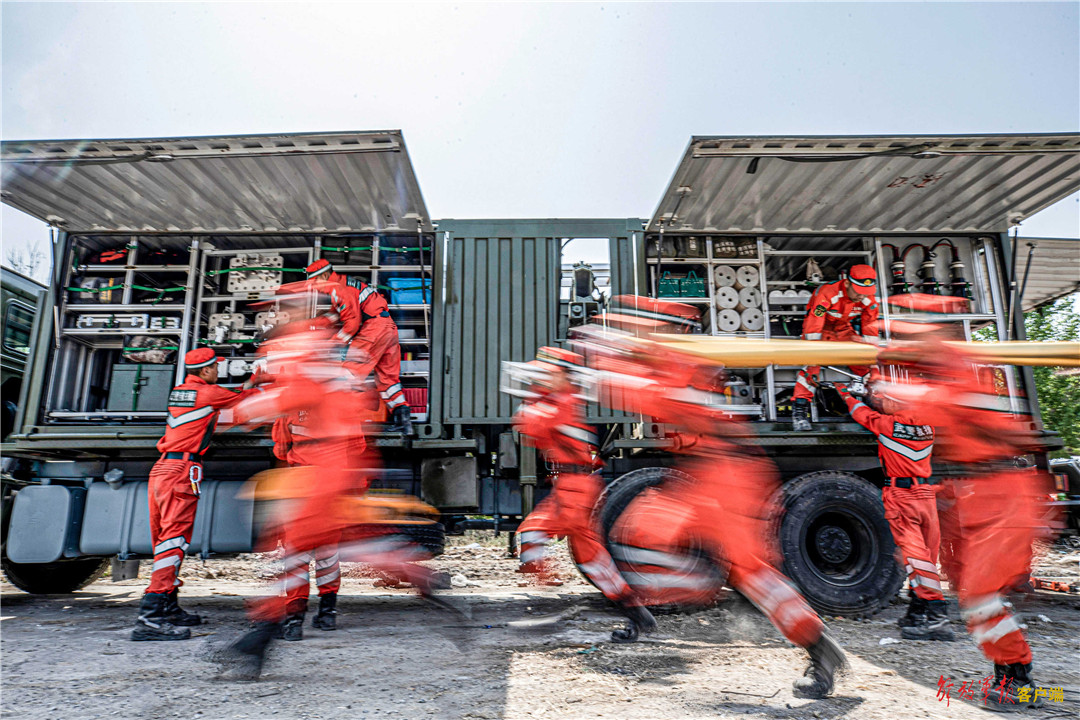 救援分队官兵携带救援器材快速出动。