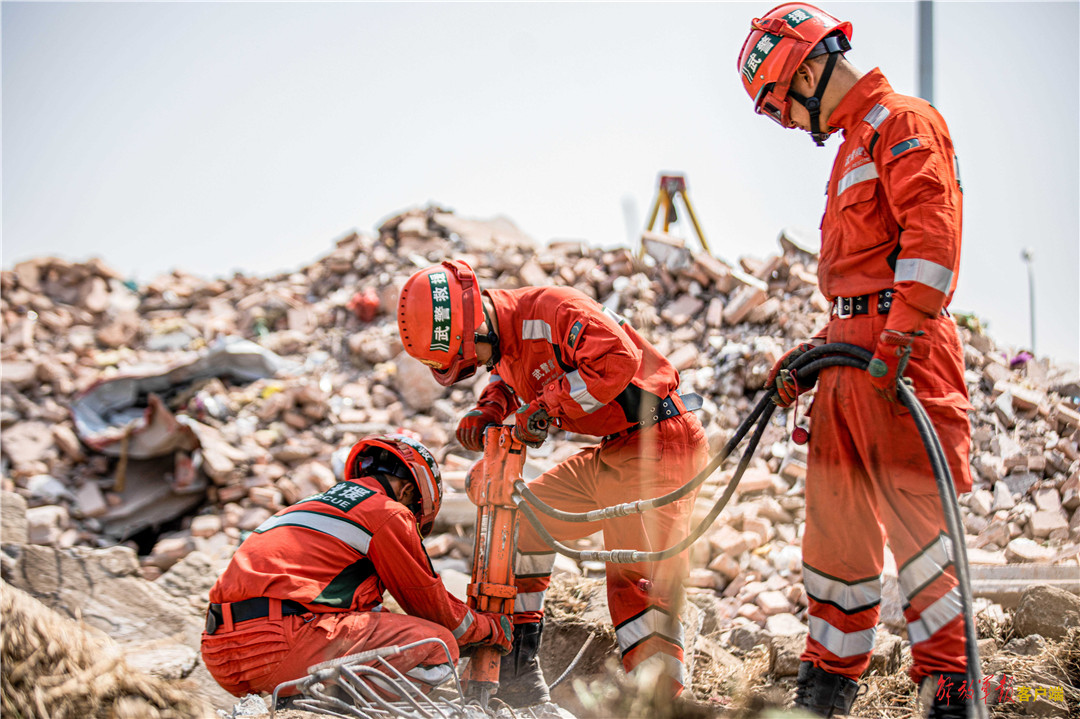 救援分队官兵正在进行破拆工作。
