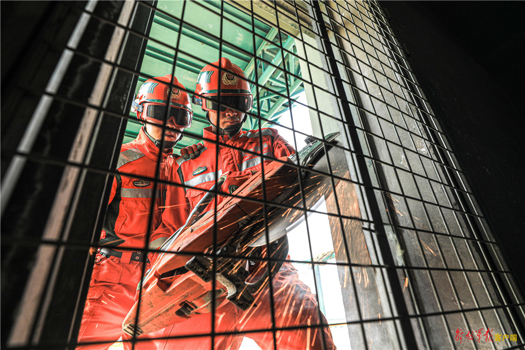 救援分队官兵利用器材进行快速破拆。