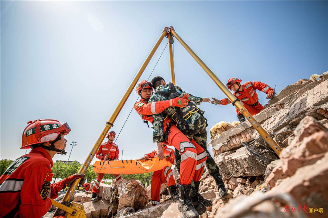 救援分队官兵协同开展竖井救援解救“被困群众”。