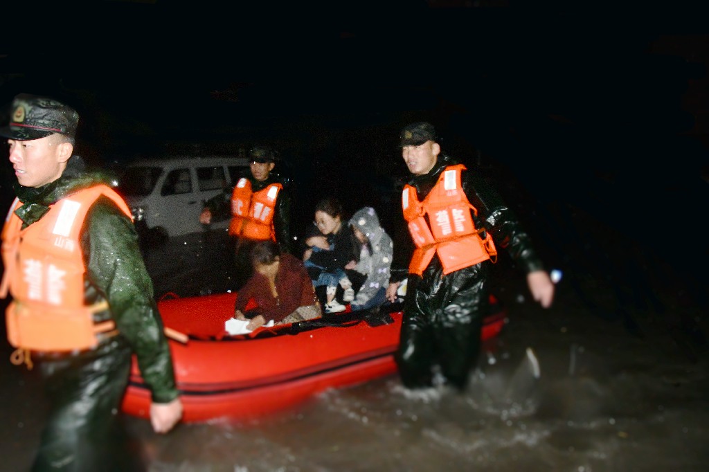 ↑10月5日,武警山西总队官兵正在太原市清徐县孟封镇东罗村转移群众。