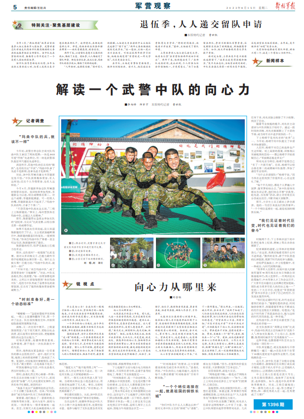 每到退伍季,为什么有的单位存在“走>留”的现象,一个重要原因就是单位的向心力不强。强军事业是由人来完成的。留不住人才,是对战斗力建设的重大损害。留人工作平时做,莫待走时空对人。增强官兵向心力,除了要把留人的工作做到前头、做在平时外,最重要的是要搞清楚向心力从哪里来。