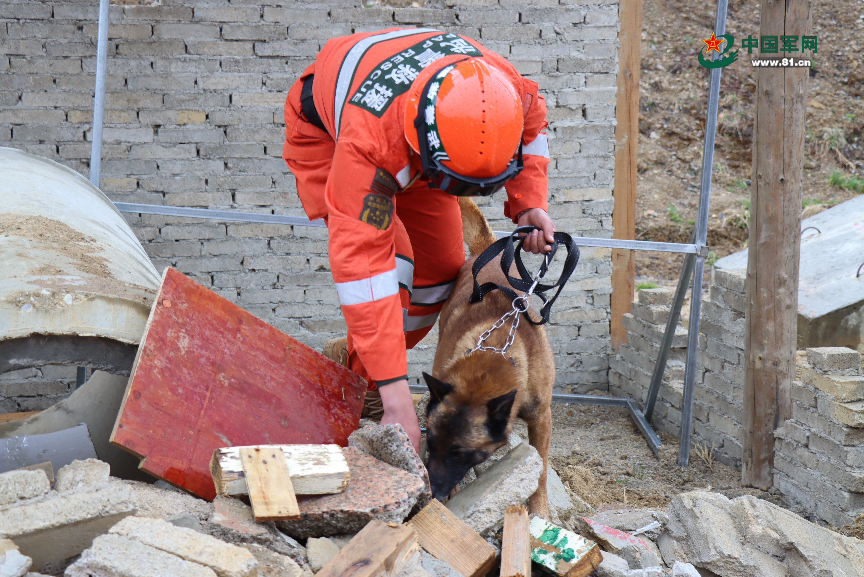 官兵带搜救犬进行搜索。张泰笙 摄
