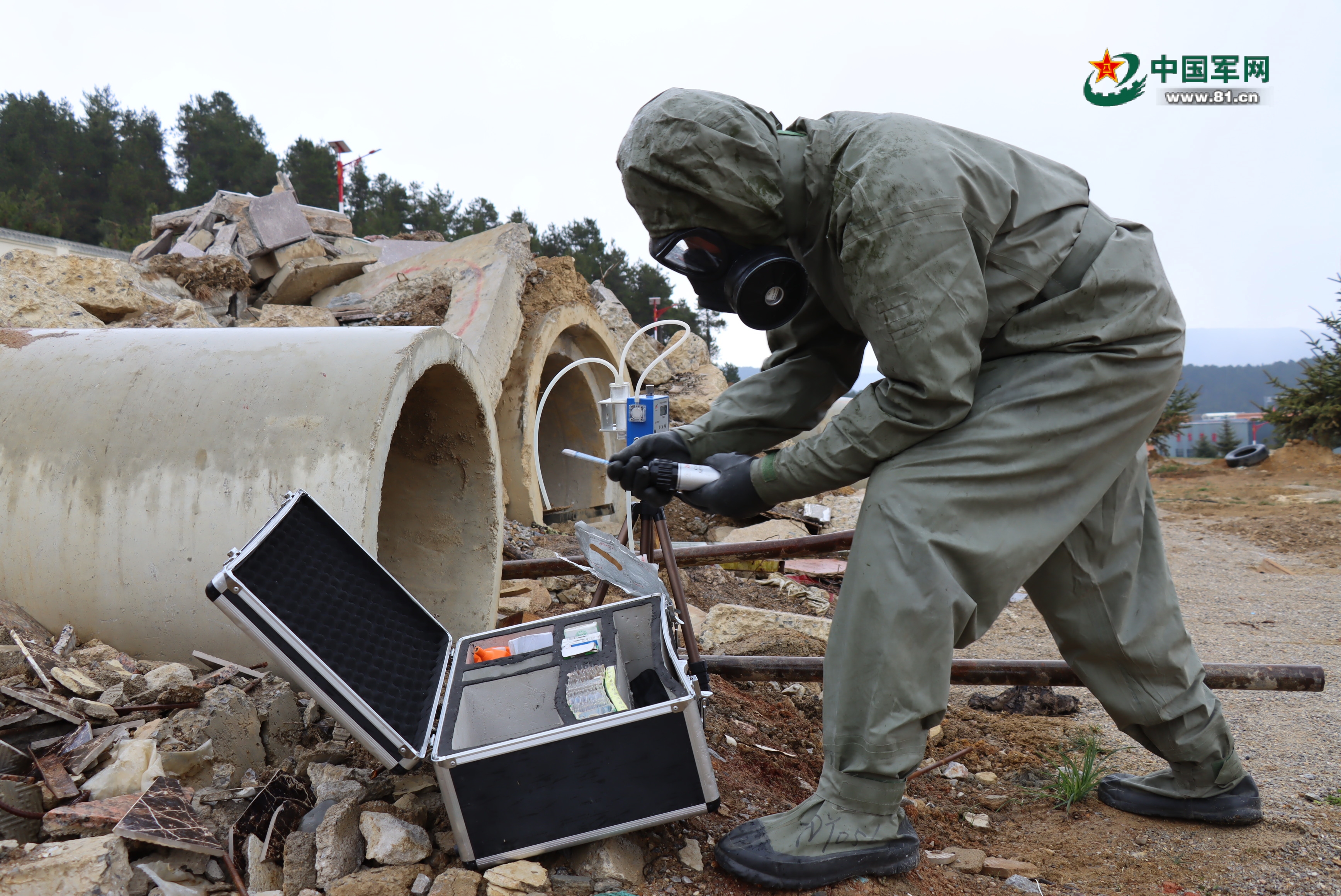 官兵对救灾现场进行有害气体检测。陈宇翔 摄