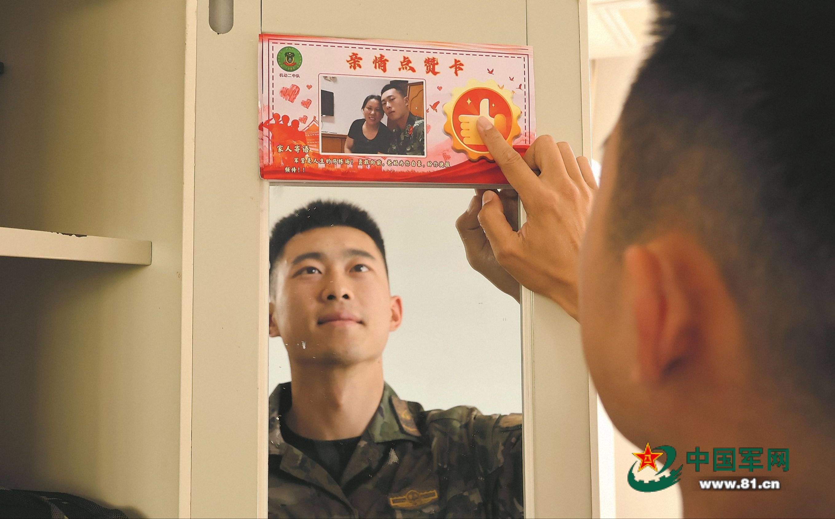 在这个中队,每名官兵的内务柜都贴着这样一张卡片。卡片上,有父母慈祥的面孔、子女可爱的模样、妻子温柔的笑颜,还有亲人熟悉的声音。大家给它起了个名字:“亲情点赞卡”。