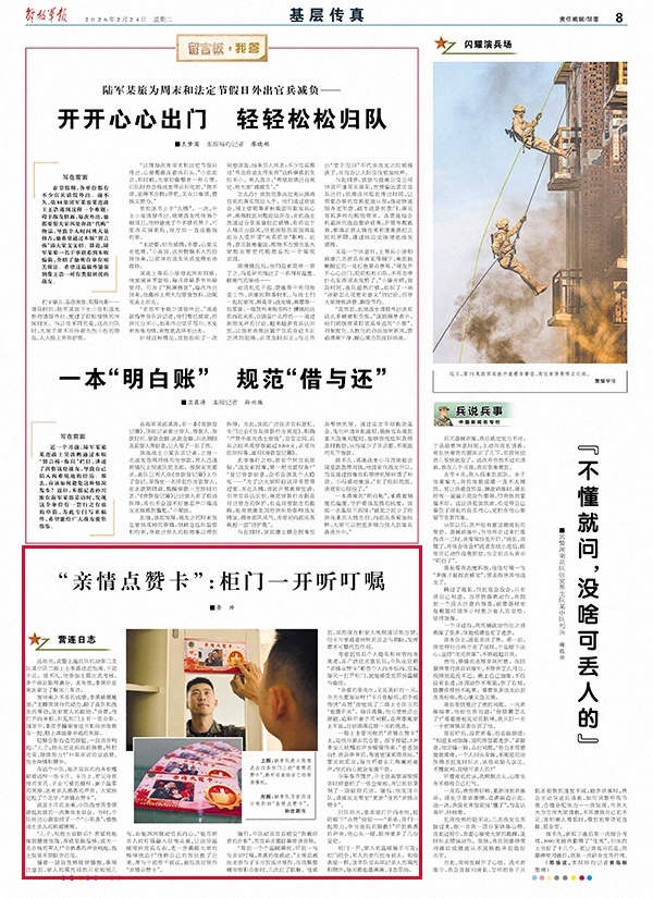 “亲爱的张先生,又是美好的一天,今天也要加油呀!”卡片张贴后,那个拇指状“点赞”按钮成了二级上士张玉的“能量开关”。每日清晨,他习惯性点击按钮,边聆听妻子的问候,边利落地穿上军装,自信满满迎接一天的挑战。