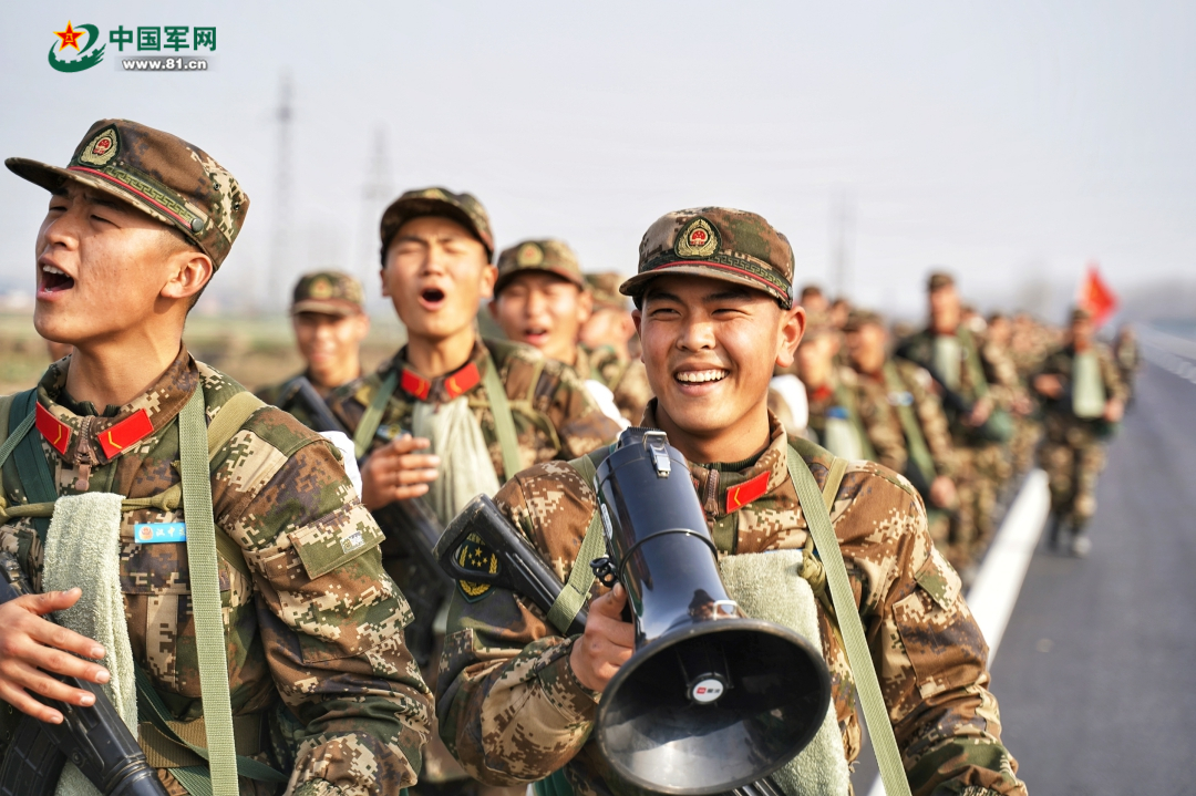 寒风中,官兵们前互相激励,一路呼号、一路歌声,跟随着鲜红的旗帜,大步流星向前走。第一次野营拉练让新兵周浩栋倍感兴奋,他笑着说:“有战友们并肩前行,我一点儿也不觉得累!”