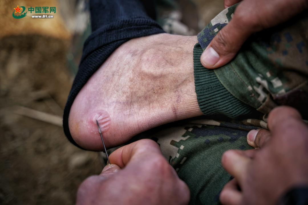 拉练途中,处理磨伤。 李淼摄