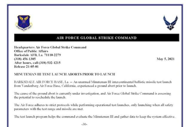 美空军全球打击司令部当天在一份声明中说,位于加利福尼亚州的范登堡空军基地计划试射一枚未携带弹头的“民兵3”洲际弹道导弹,试射在导弹发射前被临时中止,原因正在调查中。空军全球打击司令部正对改期试射进行评估。