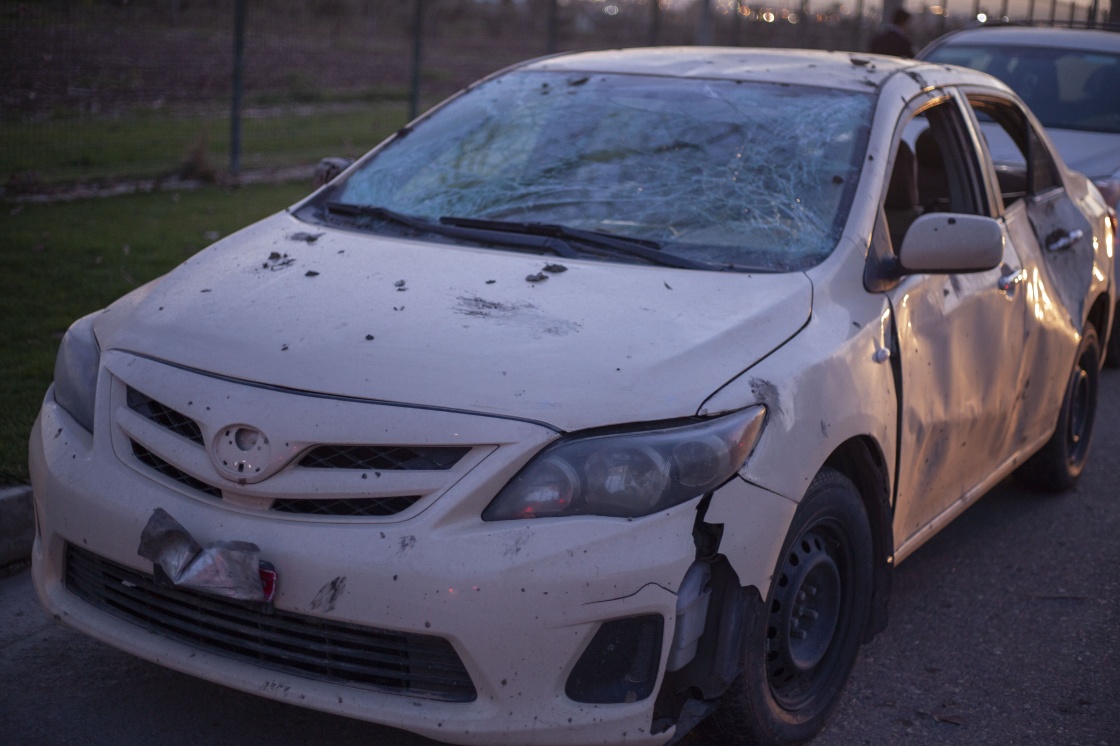3月13日,在伊拉克库尔德自治区首府埃尔比勒,美国驻埃尔比勒领馆附近的一辆汽车在导弹袭击中受损。新华社发(达尔沙德摄)