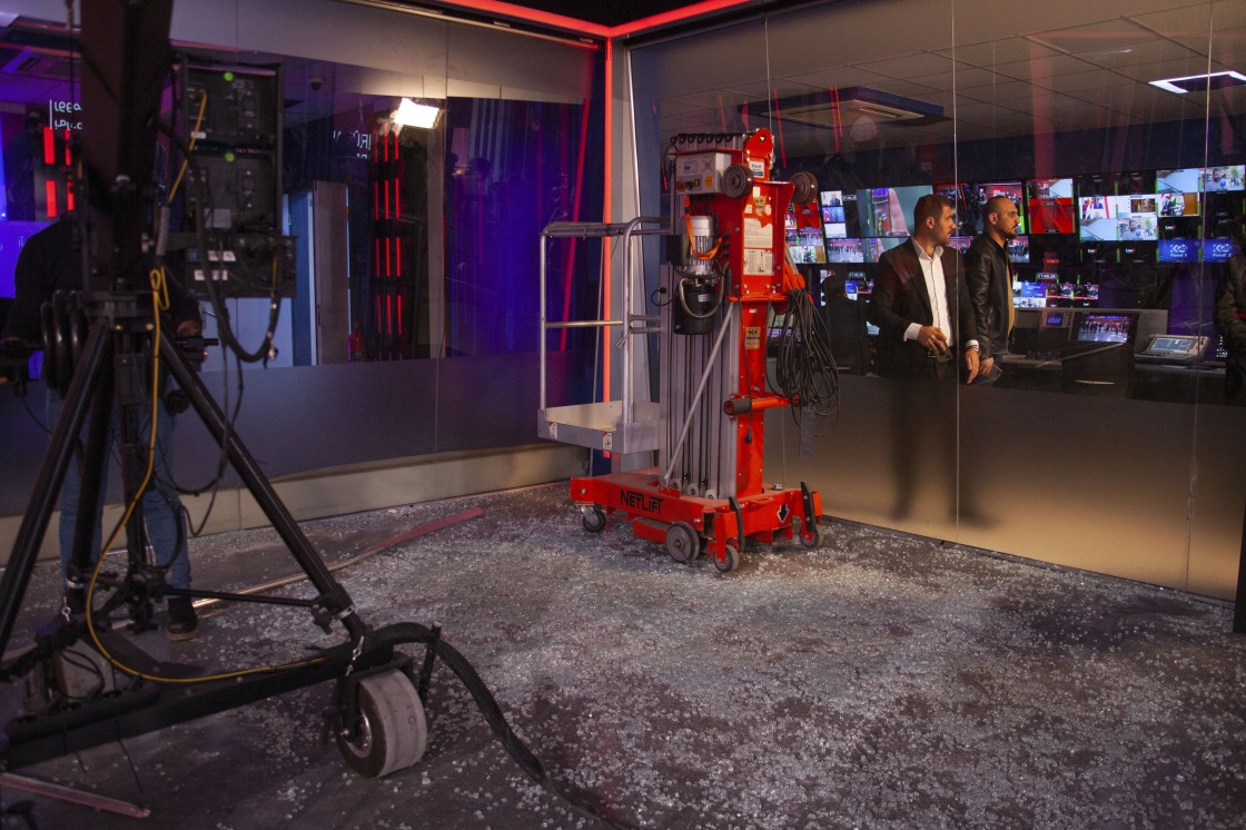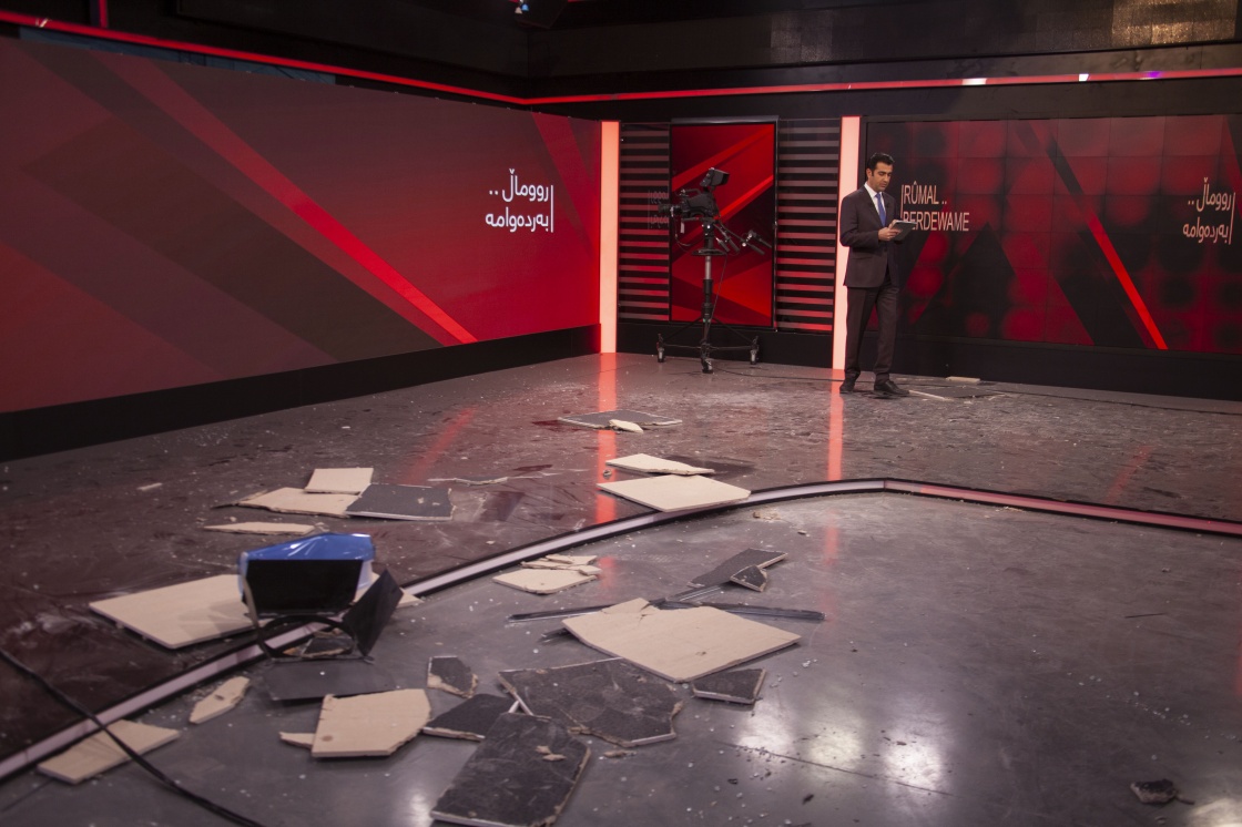 3月13日,在伊拉克库尔德自治区首府埃尔比勒,一家电视台的演播室在导弹袭击中受损。新华社发(达尔沙德摄)