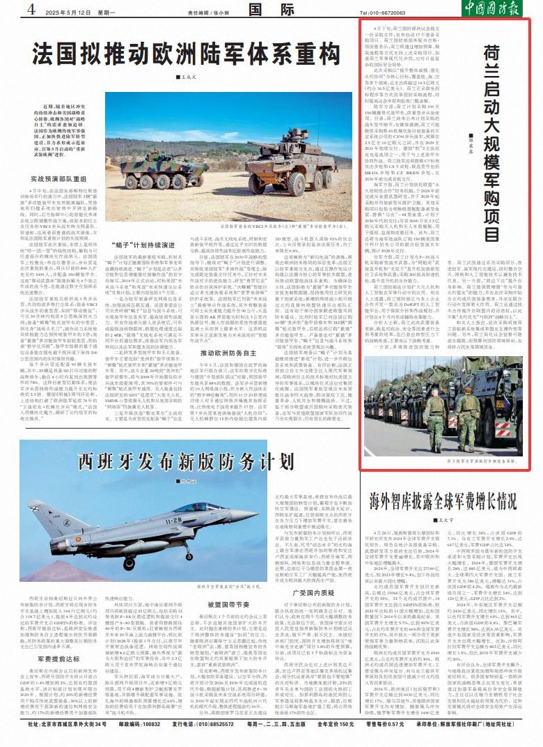 4月下旬,荷兰国防部向议会提交一份采购文件,宣布启动17个装备采购项目。荷兰国防部国务秘书吉斯·图因曼表示,荷兰将通过增加预算、精简流程等方式支持上述采购项目,加速荷兰军事现代化步伐,应对日益复杂的国际安全局势。