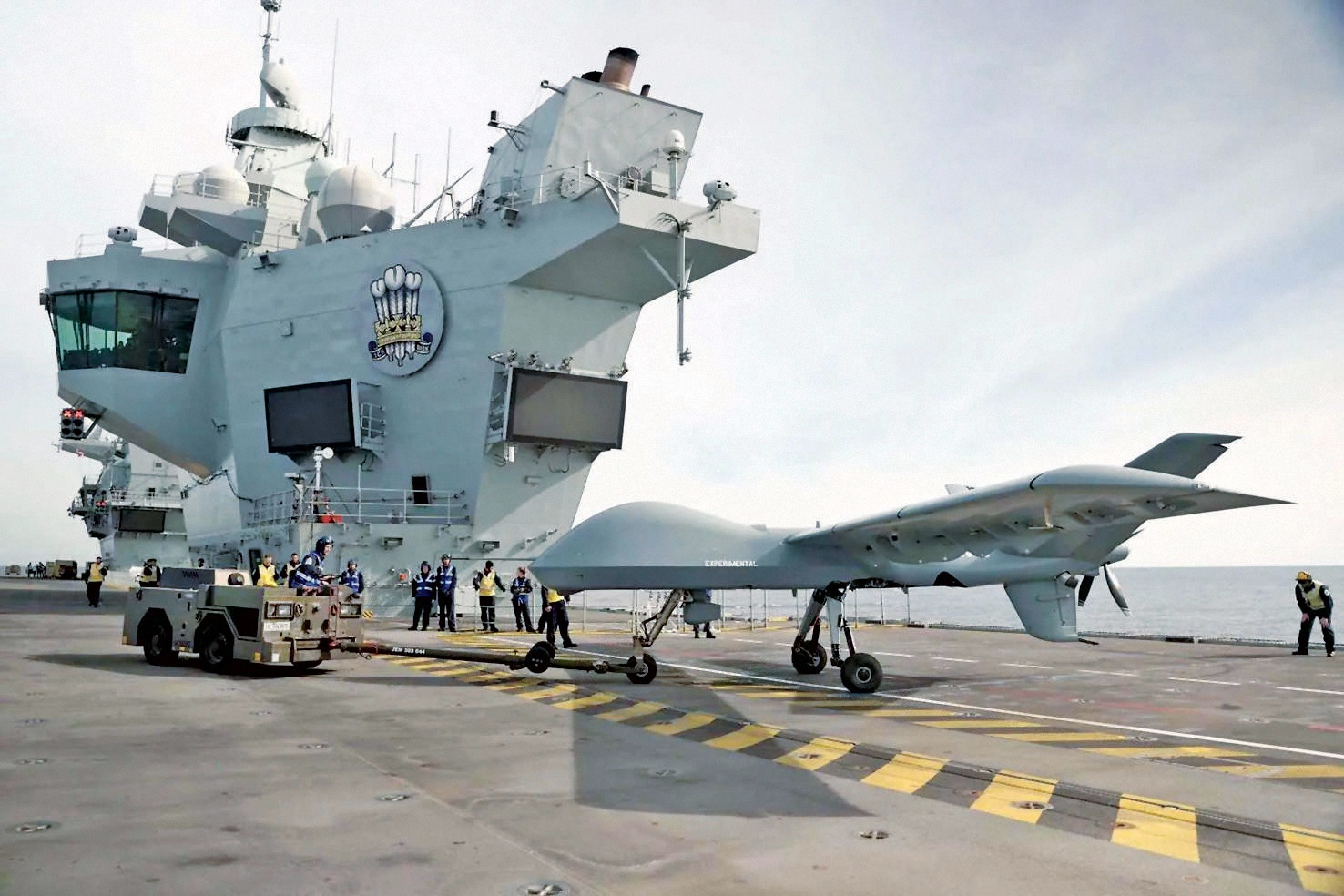 英国海军在“威尔士亲王”号航母上进行无人机起降测试。