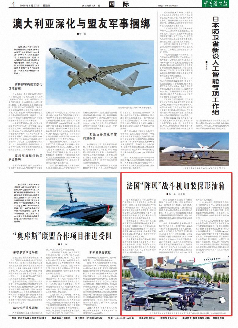 分析人士认为,“阵风”B战斗机加装的保形油箱,可能属于其最新型号F5技术配置的组成部分。根据法国国防部于2023年披露的规划,F5型“阵风”战斗机将挂载下一代核导弹ASN4G、SCALP巡航导弹的替代型号和高超音速武器。保形油箱的加装,不仅有助于上述弹药的挂载,还将在一定程度上增加战斗机的航程。然而,对于“阵风”战斗机的大部分潜在用户而言,是否接受并选用保形油箱配置尚难判断,其市场接受度最终取决于用户对航程与机动性的权衡。