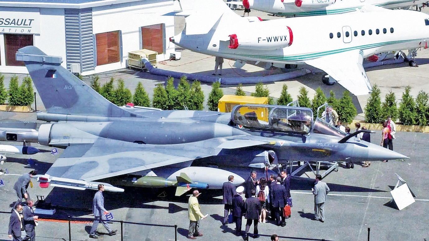 在巴黎国际航空航天展览会上展出的法国“阵风”B战斗机,图中红圈处为加装的保形油箱。