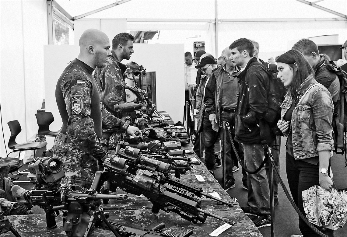 德国联邦国防军成员在开放日活动上向参观者介绍武器装备。新华社记者 单宇琦摄