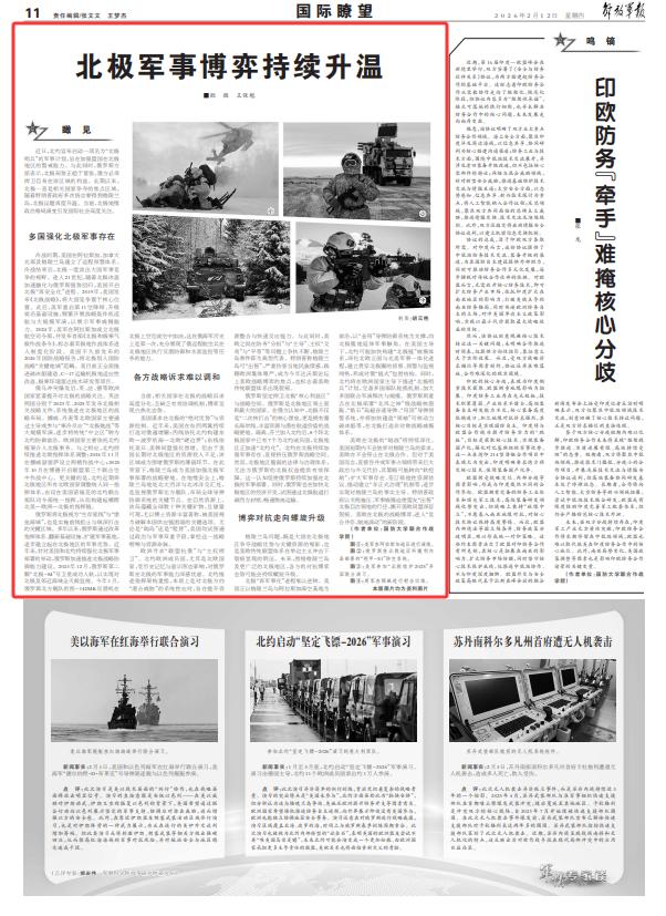 冷战时期,美国在阿拉斯加、加拿大北部及格陵兰岛建立了远程预警体系。冷战结束后,北极一度淡出大国军事竞争的视野。进入21世纪,随着北极冰盖加速融化与俄罗斯强势回归,美国开启北极“再安全化”进程。2019年,美国发布《北极战略》,将大国竞争置于核心位置。此后,美军重启第11空降师、升级前沿基础设施,频繁开展战略轰炸机巡航与大规模军演,以展示军事威慑能力。2024年,美军在阿拉斯加成立北极航空司令部,并发布首部《北极和极寒气候作战条令》,标志着其极地作战体系进入制度化阶段。美国不久前发布的2026年国防战略报告,将北极划入国防战略“关键地域”范畴。美目前正全面推进破冰船建造、C-17运输机极地适应性改造、极寒环境雷达技术研发等项目。