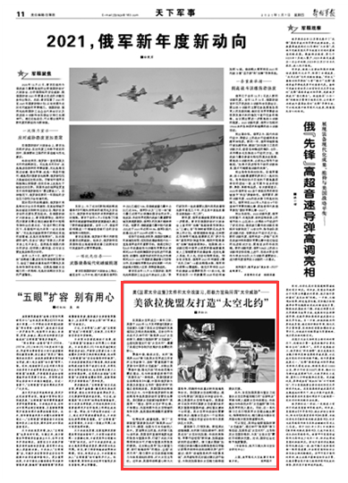 在美国太空军成立一周年之际,美国于2020年12月发布新版《国家太空政策》,勾勒了美在太空领域的发展规划以及相关具体措施。这份文件与此前不久举行的“施里弗2020”太空战演习,都极力渲染所谓“太空威胁”,企图拉拢盟友打造“太空北约”,暴露了其通过争夺制天权维护自身霸权的野心。