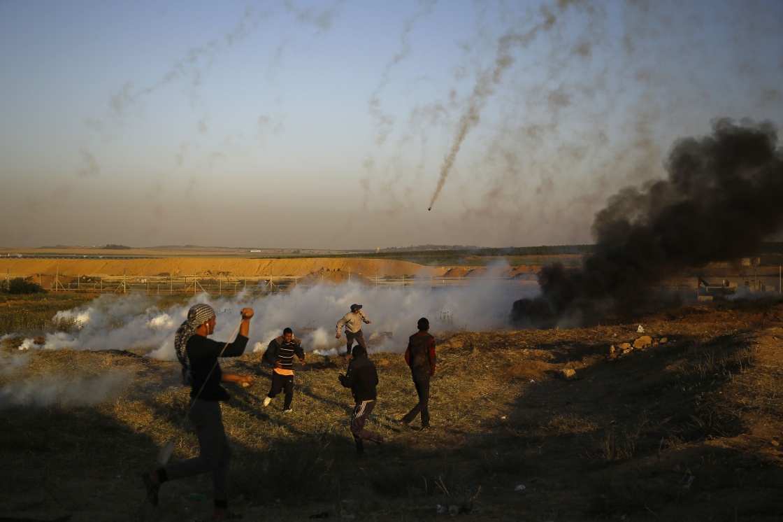 在加沙地带边境地区,巴勒斯坦示威者躲避以色列士兵发射的催泪弹。 新华社/法新
