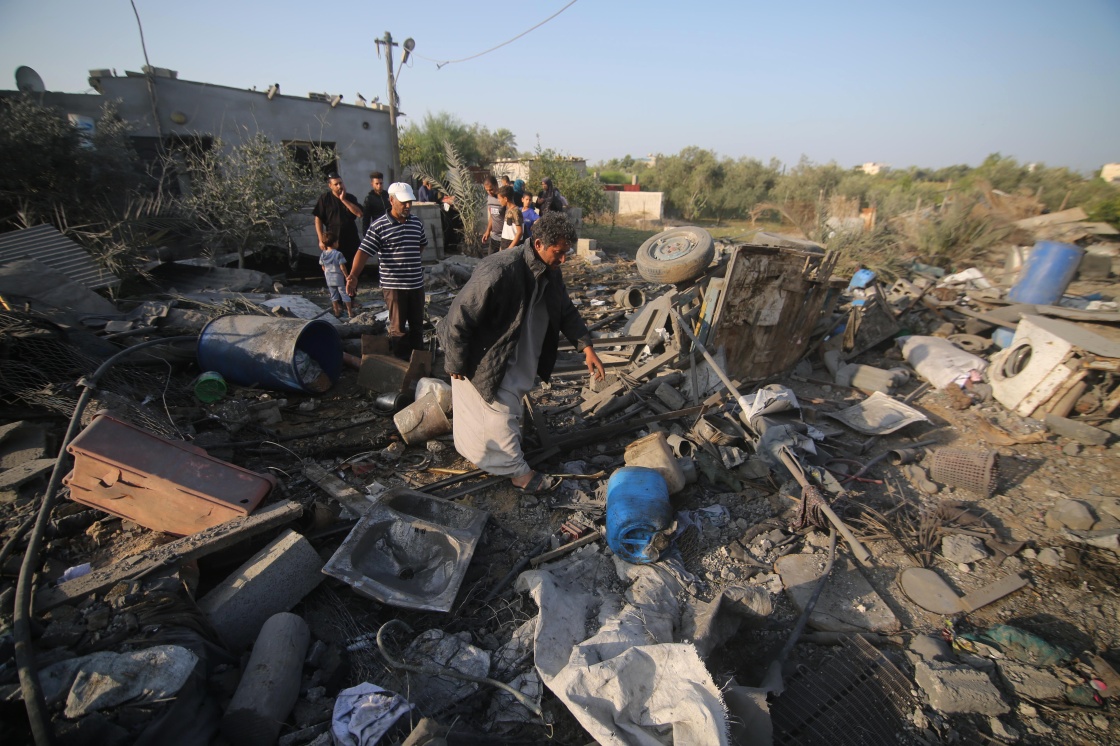 11月14日,在加沙地带代尔拜拉赫,巴勒斯坦民众行走在遭空袭后的废墟中。新华社发(哈立德·奥马尔摄)