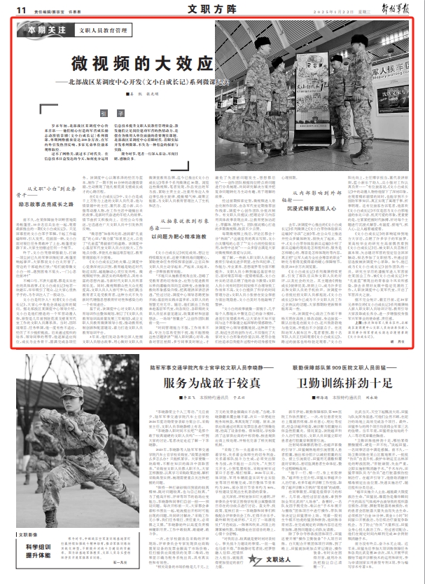 3年来,他们发动各单位深入挖掘文职人员励志故事,用心做好文职人员微课堂教育品牌,迄今已推出《文小白成长记》等多个系列微课近30期。浏览这些微视频,笔者发现,作品突出姓军为战、紧贴主责主业,注重用身边人身边事弘扬主旋律、提振精气神、凝聚正能量,为文职人员教育管理注入了生机和活力。