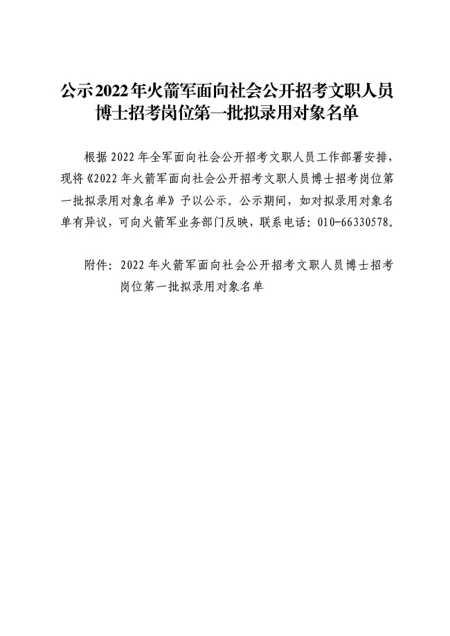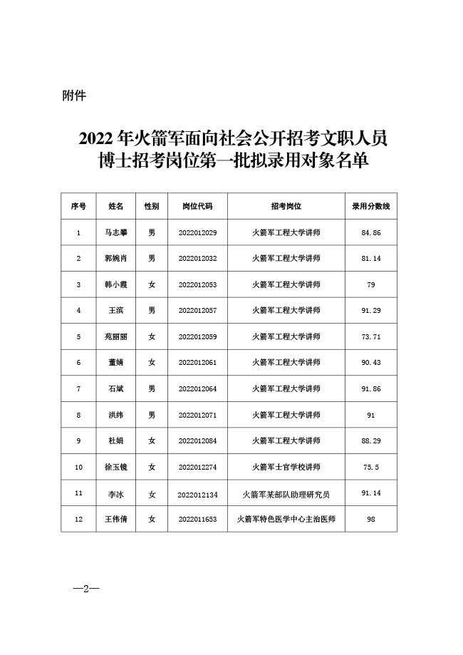 公示2022年火箭军面向社会公开招考文职人员博士招考岗位第一批拟录用对象名单