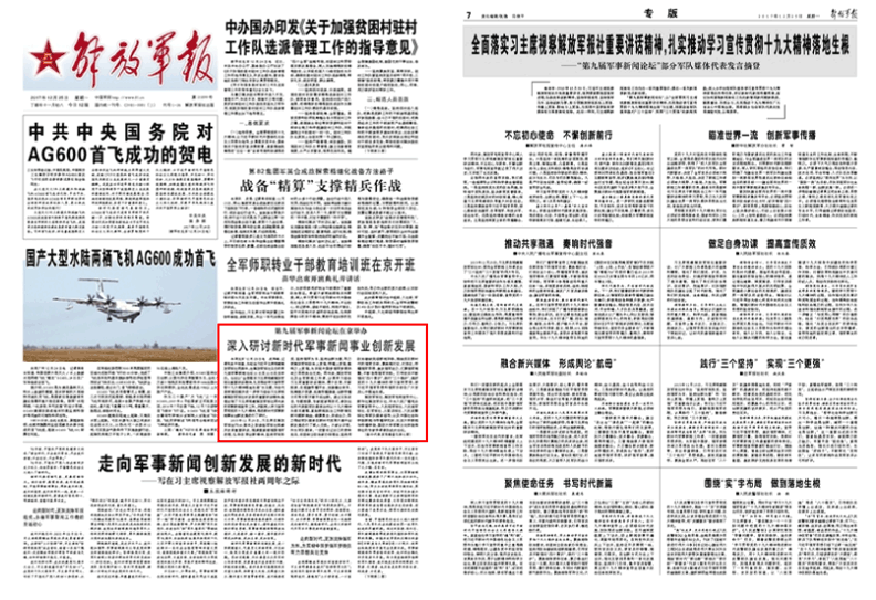 为纪念习近平主席视察解放军报社两周年,由解放军报社主办的第九届军事新闻论坛21日至22日在京举办。论坛以“全面落实习主席视察解放军报社重要讲话精神,扎实推动学习宣传贯彻十九大精神落地生根”为主题,与会代表深情回顾并进一步学习领会习主席视察解放军报社时发表的重要讲话精神,梳理总结了习主席视察解放军报社两年来的军事新闻宣传工作,并就深入学习宣传贯彻党的十九大精神,推进新时代军事新闻事业创新发展进行了研讨。请关注今日出版的《解放军报》的文章——
