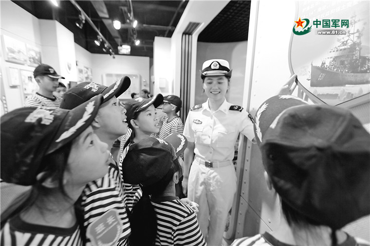 东海舰队某驱逐舰支队邀请共建城市小学生参加军事夏令营活动。图为小学生们在参观军史馆。史奎吉摄